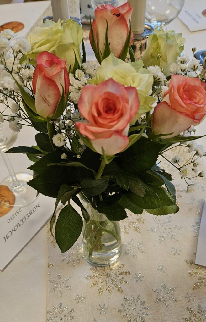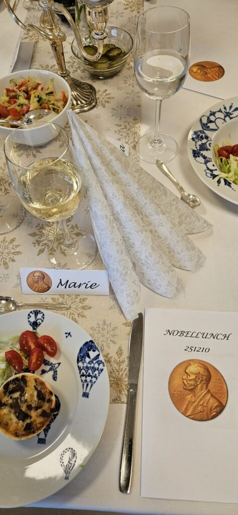 Vi började med att skåla för Alfred Nobel innan vi satte oss till bords.