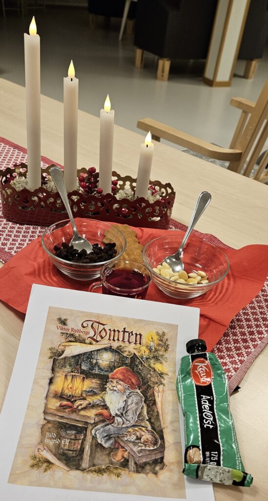 På eftermiddagen firade vi 4:e advent med glögg och pepparkakor med ädelost. Sedan rättade vi veckans tipspromenad som hade jultema och drack kaffe. Vi avslutade med att läsa Viktor Rydbergs Tomten.