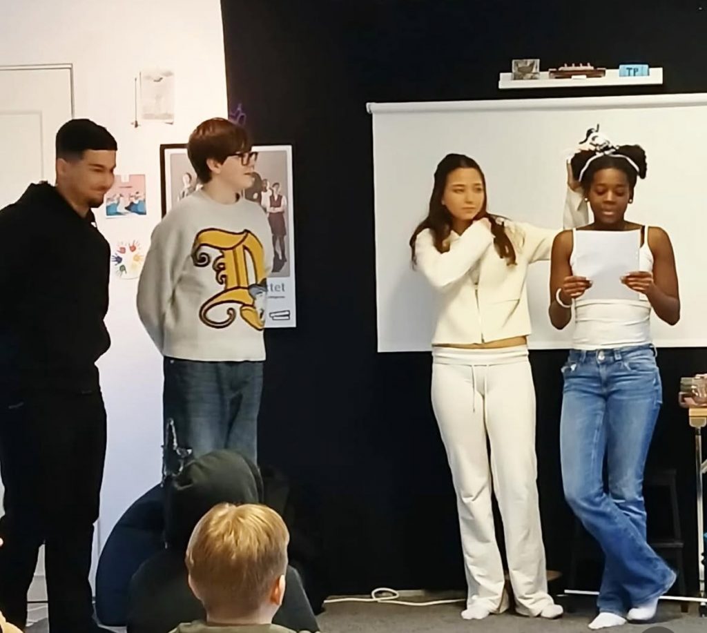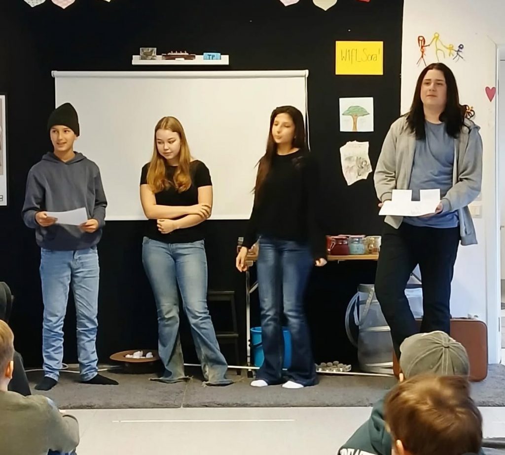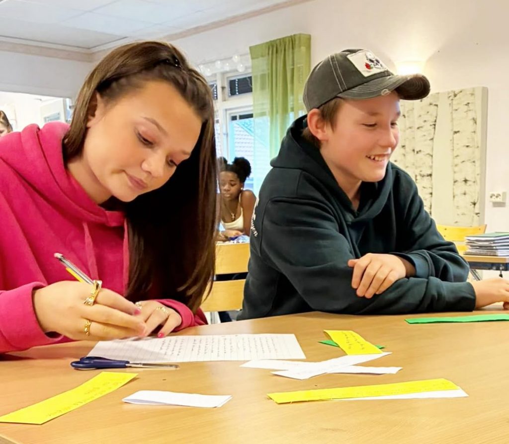 Eleverna fick skriva meningar om fru Zucker – vad hon säger till flickan, vad hur tänker och vad hon ser omkring sig. Dessa meningar blev grunden för dagens skapande övning där ett pussel lades som resulterade i texter och skulpturer som gestaltade fru Zuckers altruism, att hon handlade osjälviskt och utan tanke på egen belöning.