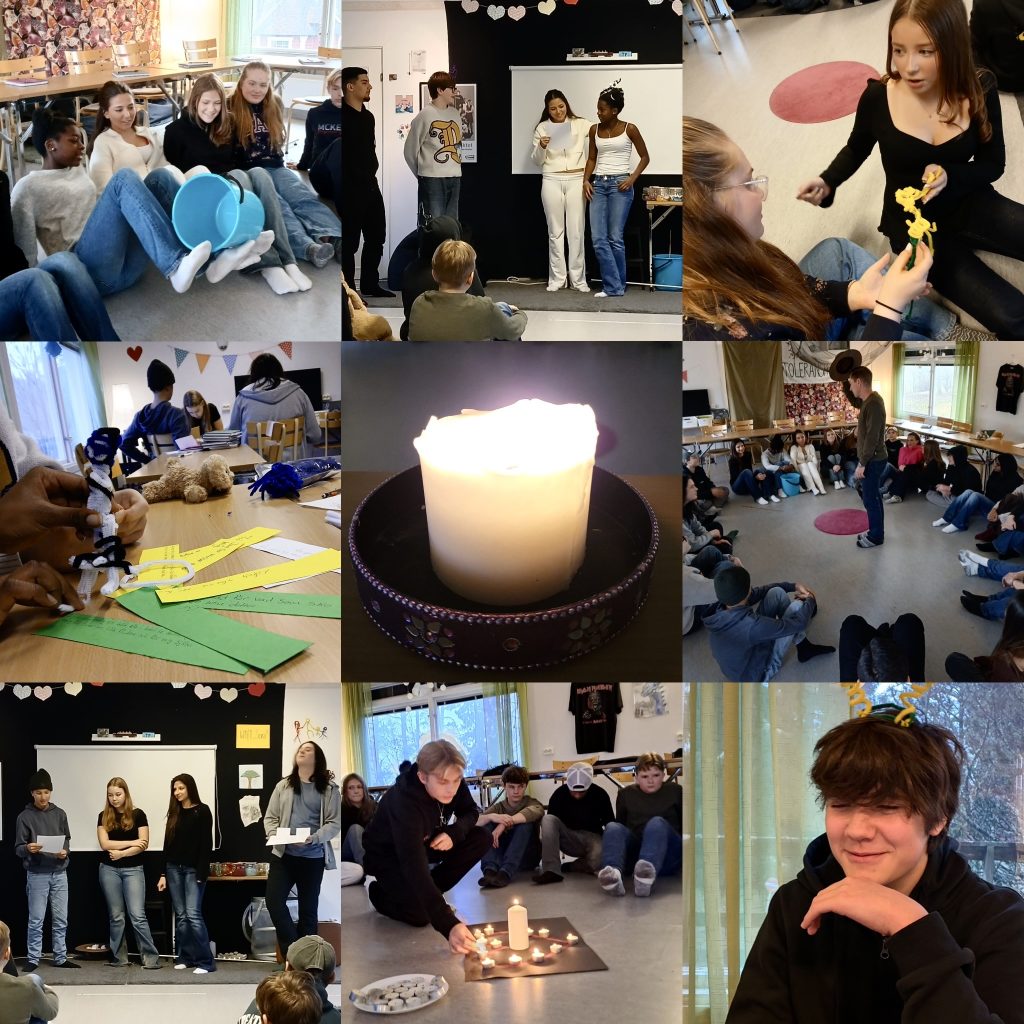 Det femte temat våra elever fick möta i Toleransprojektet var: KÄRLEK och ALTRUISM. Vi inledde morgonen med att följa upp förra gångens läxa som handlade om att vara modig och vi funderade över vilka olika slags handlingar vi visar andra människor kärlek genom. Att finnas där för andra, ge komplimanger, visa omsorg, vara generös, säga hej – var bara några av de saker eleverna gav som förslag.