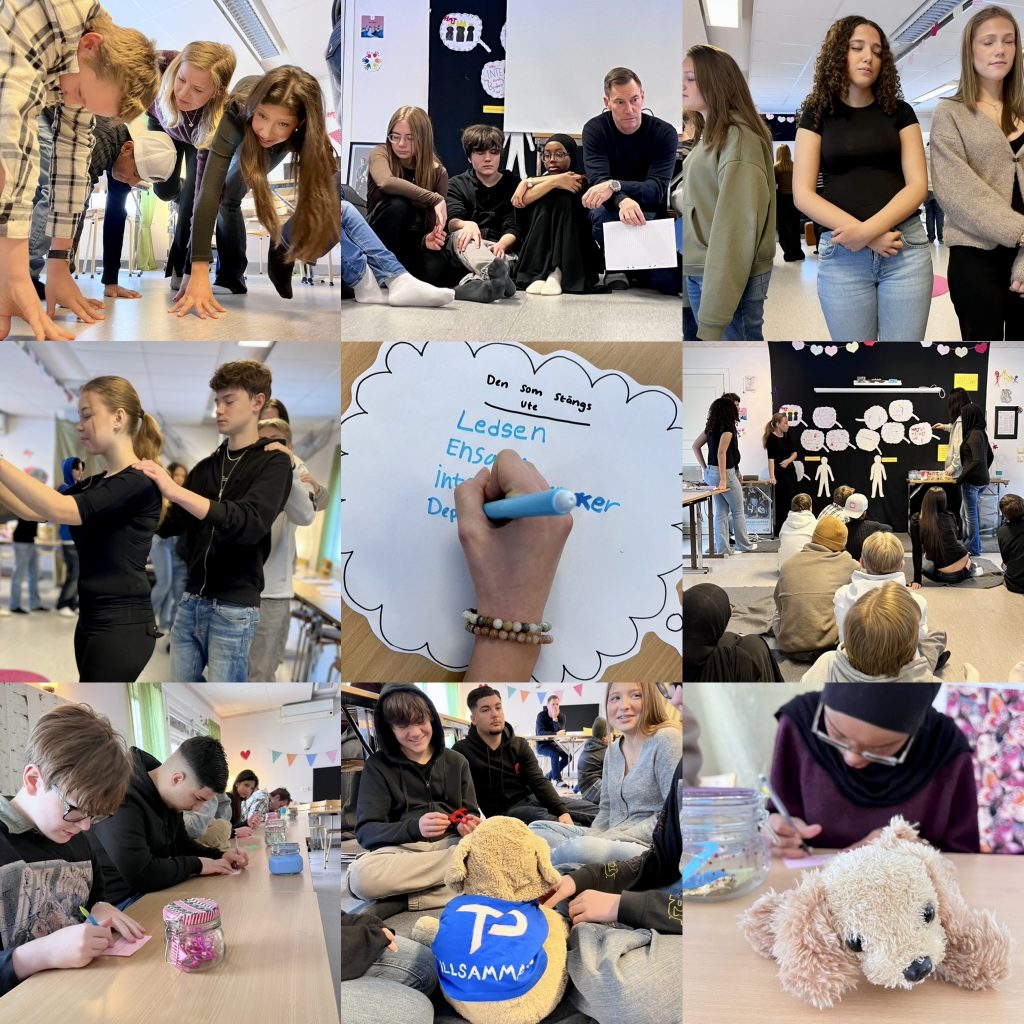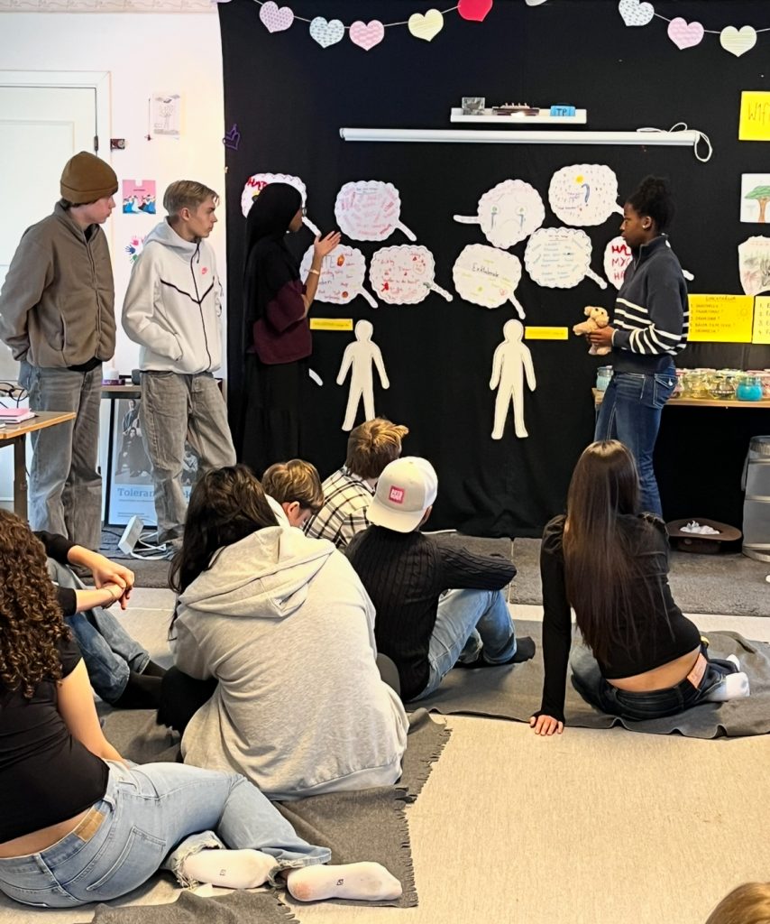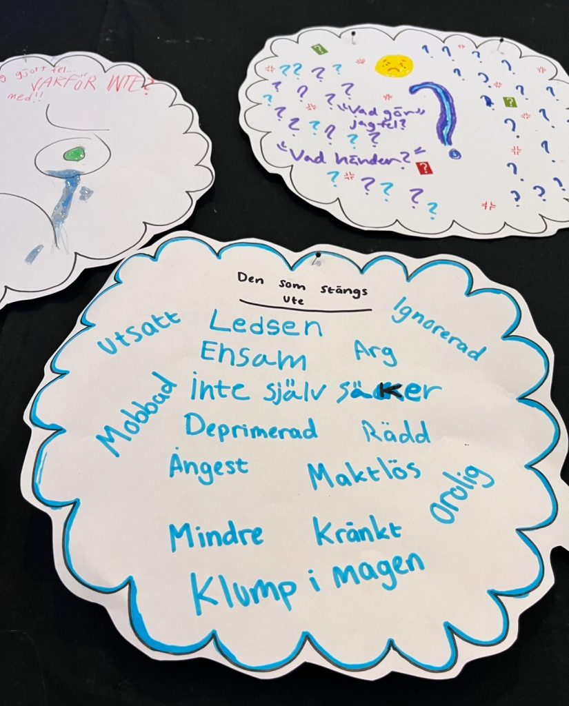 Näst på tur stod lunch och efter det fick grupperna i uppgift att med hjälp av två tankebubblor fundera kring den som exkluderar och den som exkluderas. Vilka tankar, känslor och beteenden finns inuti den som stänger andra ute och i den som utestängs? Många kloka tankar fyllde vårt klassrum.