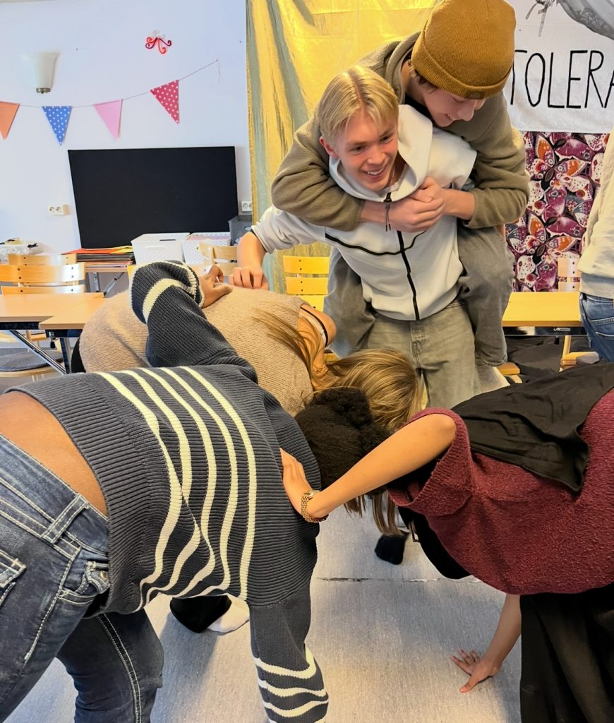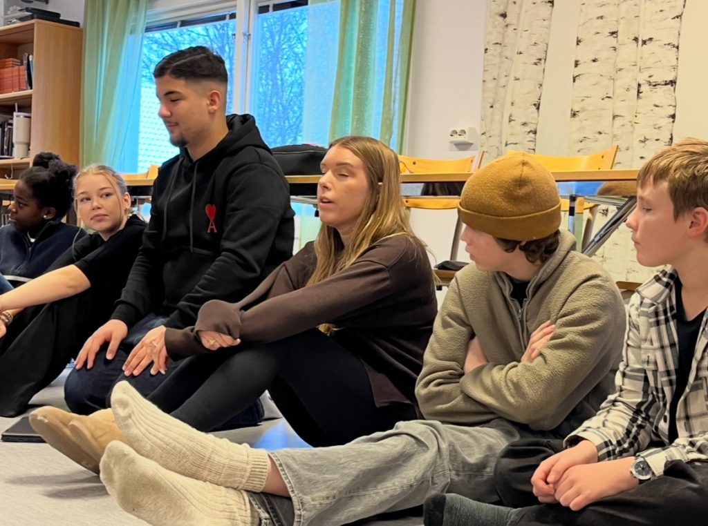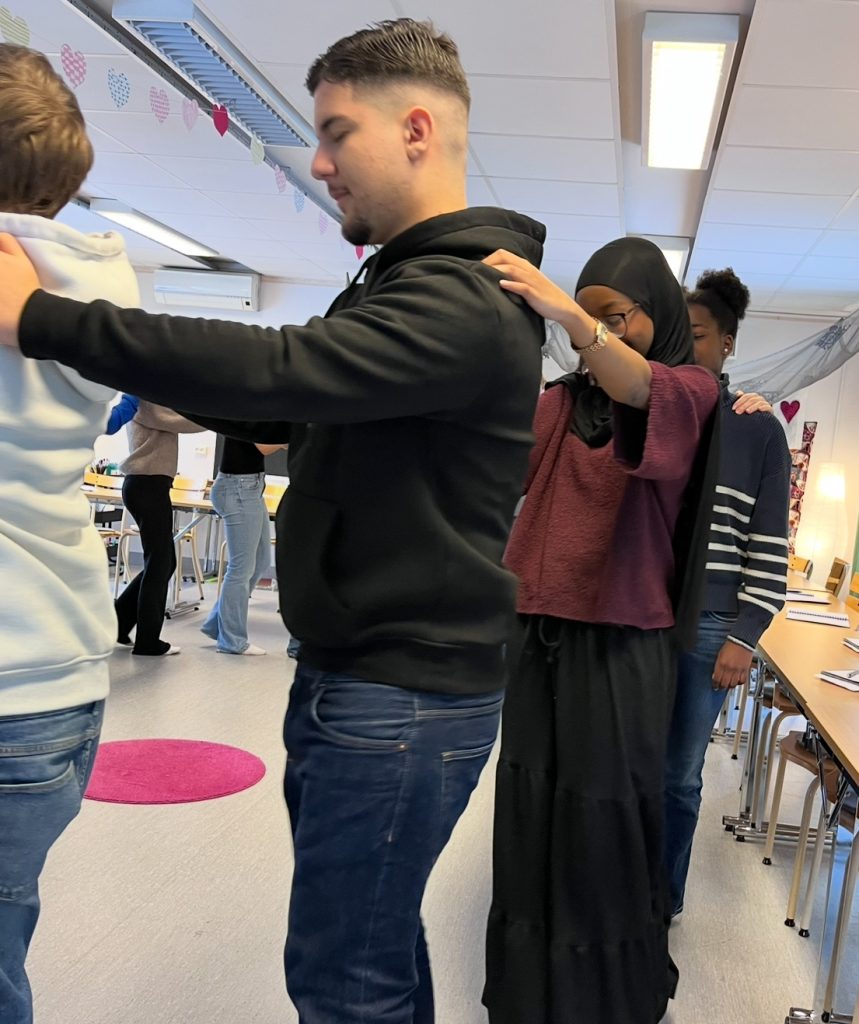 Som vanligt när vi suttit fullt koncentrerade en stund bryter vi för en stunds fysisk aktivitet och ofta något slags samarbetsmoment. Idag blev det gruppskulpturer med olika antal händer och fötter i golvet och samarbete genom att räkna som hjälpte till att skapa energi och skärpa inför fortsättningen.