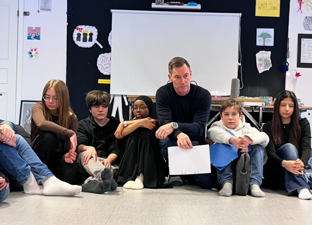 Den första snön hade fallit denna torsdag. Väl inne i värmen hade vi först en uppföljning av läxan utifrån den andra träffens tema ”Vem är jag?” Eleverna fick se hur många olika ord de använder när de beskriver sin identitet. Vi människor är så många saker och alla kämpar med något. Alla fick också skriva ner namnet på en förebild i fråga om mod att lägga i sin glasburk.